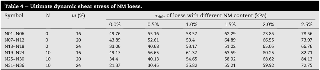 圖3描述了在各種評(píng)估條件下的動(dòng)態(tài)剪切應(yīng)變-模量之間的關(guān)系。正如預(yù)期的那樣,隨著應(yīng)變的增加,剪切模量有一個(gè)下降的趨勢。先出現(xiàn)緩慢的降低,然后呈現(xiàn)出大幅下降。此外,我們觀察到,動(dòng)態(tài)剪切應(yīng)變-模量曲線隨著NM的增加而向上移動(dòng),而隨著含水量的增加而向下移動(dòng),因此含水量對凍融的有害影響被揭示出來,同時(shí)證明了納米氧化鎂顆粒對黃土在凍融循環(huán)下抗性的提升作用。