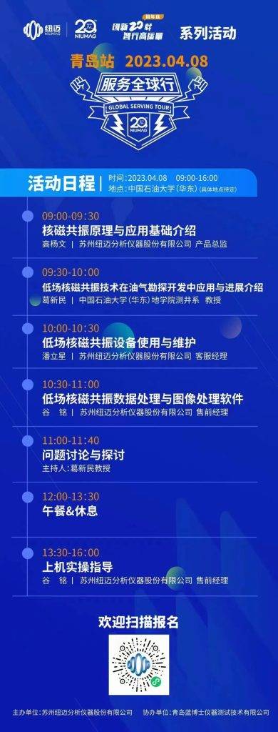 在這個春和景明,春林初盛的季節(jié),紐邁分析第四屆服務(wù)全球行2023年度活動即將開啟,4月8日(周六)與您相約中國石油大學(xué)(華東),青島站。
