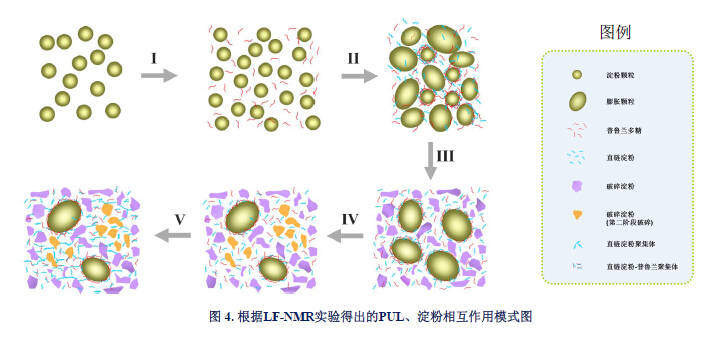 同時(shí),PUL還可能與滲漏出來(lái)的直鏈淀粉相互作用,形成特殊的淀粉分子-膠體分子凝膠網(wǎng)絡(luò)結(jié)構(gòu),并具有束縛水分子自由運(yùn)動(dòng)的性質(zhì)(圖1)。