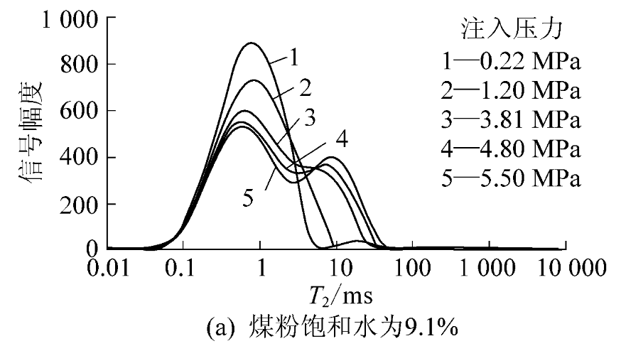 分析上圖可知,當(dāng)飽和水煤粉浸沒(méi)在不同壓力的CO2中時(shí),煤粉的核磁共振T2譜圖由初始飽和水的單峰結(jié)構(gòu)變?yōu)槊黠@的雙峰結(jié)構(gòu)。隨著CO2氣體壓力增大,吸附水峰面積減小,同時(shí)形成一個(gè)新的毛管束縛水峰,并逐漸向右偏移,即煤中吸附水轉(zhuǎn)變?yōu)槊苁`水。當(dāng)煤粉含水量增高,吸附水達(dá)到飽和的極限,多余的水則停留在毛管孔隙成為毛管束縛水。