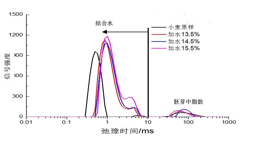 圖2-1 不同加水量潤麥24h后小麥的T2弛豫圖譜