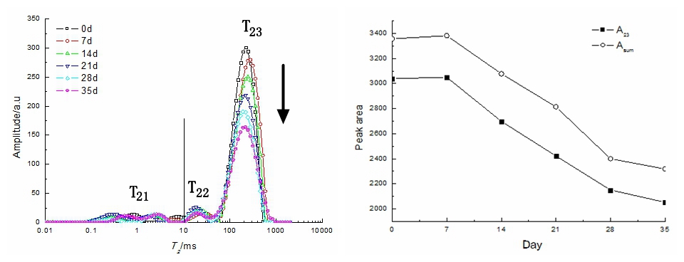 圖4.1藍莓4℃儲存過程的T2弛豫圖譜 ;圖 4.2藍莓4℃儲存過程峰面積的變化