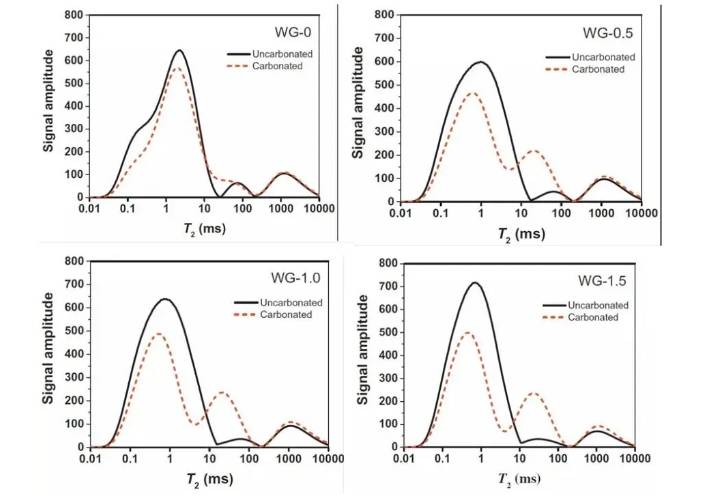 為闡述PC和AAS砂漿碳化前后的微觀孔隙結(jié)構(gòu)變化,采用紐邁分析的MacroMR12-150H-I低場(chǎng)核磁共振分析系統(tǒng),對(duì)碳化前后的40×40×40mm砂漿樣品進(jìn)行了核磁共振測(cè)試。首先,將樣品置于60°C的烘箱中24 h。然后冷卻至室溫(20°C),使用真空飽和裝置使砂漿樣品飽和。