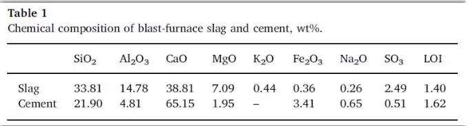 試驗(yàn)主要選用某鋼鐵公司所產(chǎn)的玻璃質(zhì)磨粒高爐礦渣和P.I 42.5硅酸鹽水泥。采用X-ray技術(shù)X射線熒光來(lái)測(cè)定礦渣和水泥的主要化學(xué)成分,具體可見(jiàn)下表。