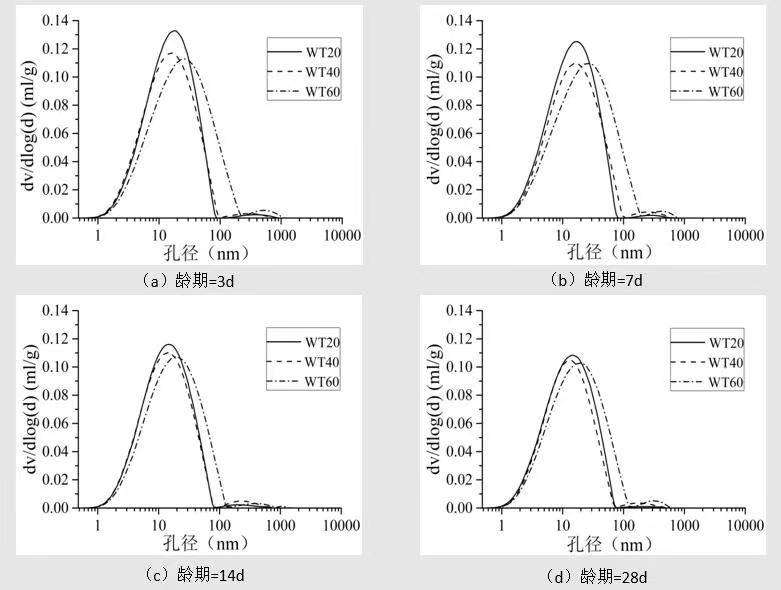 圖 3 不同養(yǎng)護溫度的補償收縮水泥漿體隨齡期變化的孔徑分布圖