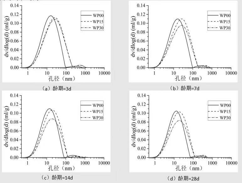 在前3天,SAP摻量越大,凝膠孔最幾孔徑越大,凝膠孔數(shù)量越多,7天后, SAP摻量越大,凝膠孔最幾孔徑下降變快并小于不摻SAP的漿體。對于毛細(xì)孔,次峰峰值隨著SAP的增加而增加。