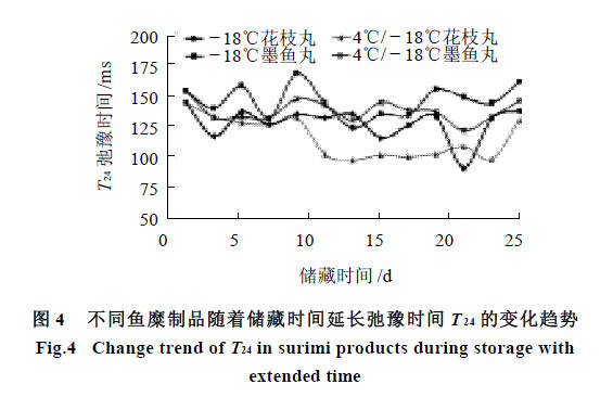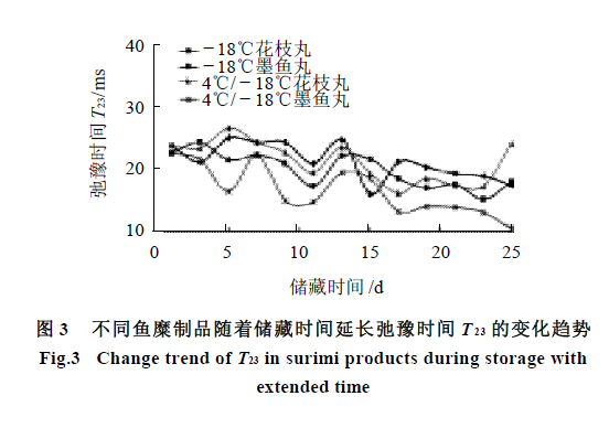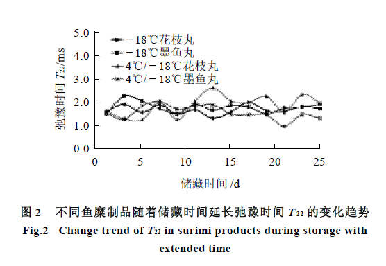 這部分水與弛豫時間為T21 的水分特性相同,水的結(jié)合力都很強,在魚糜制品中結(jié)合緊密。但T22 的結(jié)合力比T21 稍弱,這部分水與蛋白質(zhì)中的酰胺基、淀粉纖維素中的羥基形成較小的氫鍵。其結(jié)合強度比單分子層水要略差些