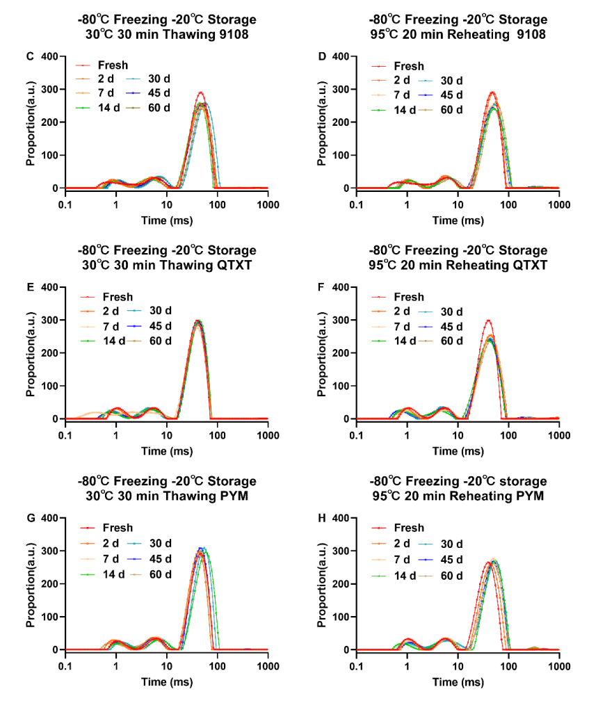 研究利用先進(jìn)技術(shù)探究不同處理方式(保留胚乳 vs. 完全碾磨)的米飯?jiān)趦霾剡^(guò)程中水分狀態(tài)變化的差異,并解釋其與質(zhì)構(gòu)穩(wěn)定性的關(guān)聯(lián)。采用了 低場(chǎng)核磁共振(LF-NMR) 和 磁共振成像(MRI) 技術(shù)來(lái)無(wú)損、非侵入性地分析米飯樣品中水分子的狀態(tài)(如結(jié)合水、不易流動(dòng)水、自由水的相對(duì)含量和分布)及其在凍藏過(guò)程中的動(dòng)態(tài)變化。