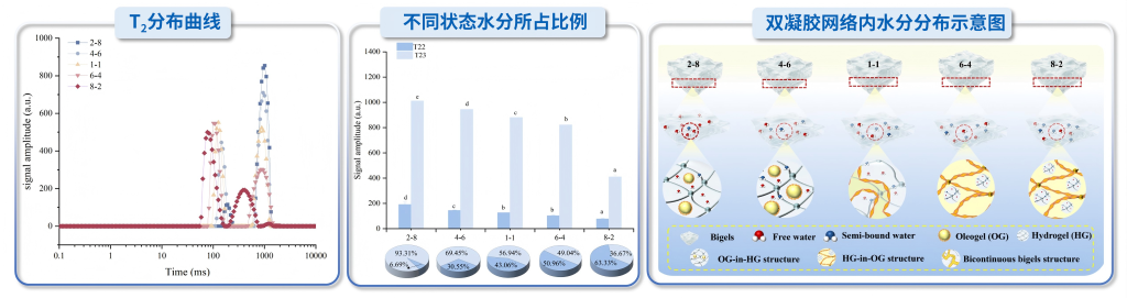 1、雙凝膠樣品包括半結(jié)合水和自由水,油凝膠和水凝膠比例的變化會(huì)影響水的流動(dòng)性和雙凝膠中水類型的分布;