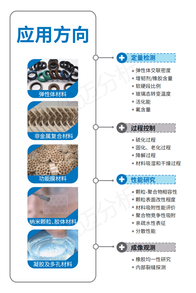 低場核磁共振技術(shù)是材料結(jié)構(gòu)與性能的重要表征技術(shù)之一。作為研究高分子聚合物、樹脂、新型表面活性劑等材料結(jié)構(gòu)和動力學(xué)特性的重要方法,低場核磁共振技術(shù)廣泛應(yīng)用于研究聚合物處于不同環(huán)境中的變化。近年來,低場核磁共振技術(shù)在材料中高分子聚合物交聯(lián)密度測試、分子結(jié)構(gòu)和晶體結(jié)構(gòu)研究、多孔材料孔隙結(jié)構(gòu)分析中成為發(fā)展最快的技術(shù)之一。