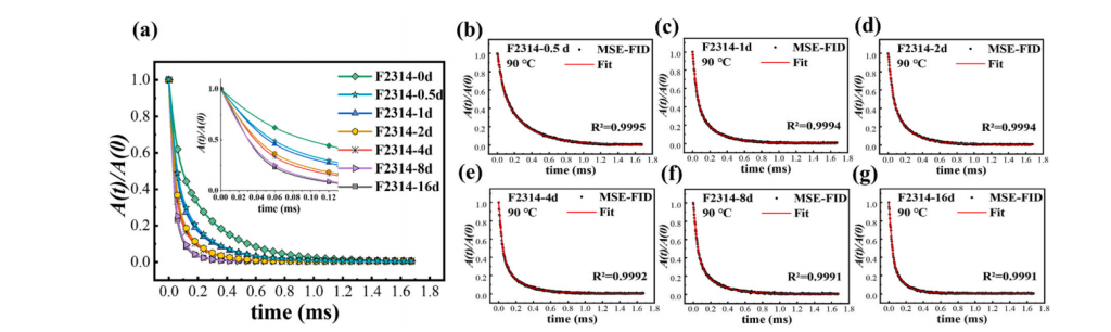 圖1:不同熱處理時長的 F2314 樣品在 90℃時歸一化 MSE-FID 的衰減情況