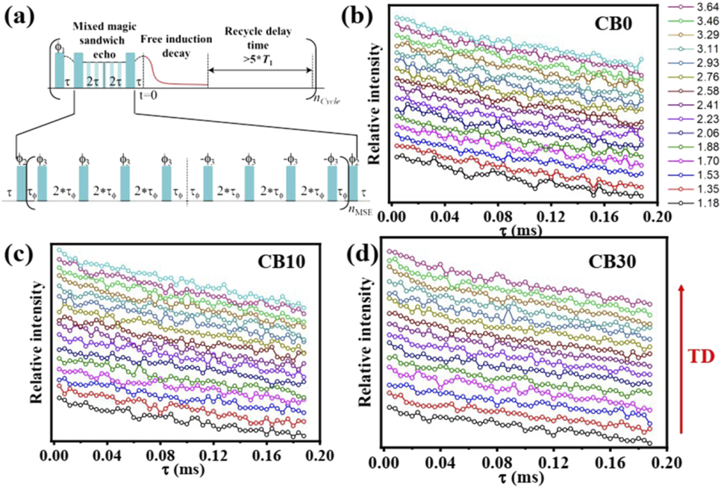 圖2:(a)MSE序列原理圖;(b)-(d)不同填料含量的天然橡膠在不同應(yīng)力下的核磁弛豫信號(hào):(b) NRCB0,(c) NRCB10, 和(d) NRCB30。