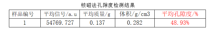 根據(jù)軟件模型的處理,低場核磁法將該樣品的孔徑分布結(jié)果完整的展現(xiàn)出來,根據(jù)結(jié)果可知,該樣品的孔隙度為48.93%,孔徑分布主要的分布峰頂點(diǎn)為13nm孔隙度分量為5.83%。(上表標(biāo)紅出)