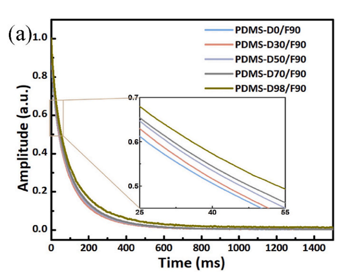 該課題組提出了一種通過在聚合物網(wǎng)絡(luò)中引入懸掛鏈的解決策略,制備了具有高熱導(dǎo)率(4.50 W/m?k)和優(yōu)異柔韌性的TIMs(伸長(zhǎng)率104%,楊氏模量0.24 MPa)。低場(chǎng)核磁測(cè)試在該應(yīng)用中發(fā)揮了重要作用。