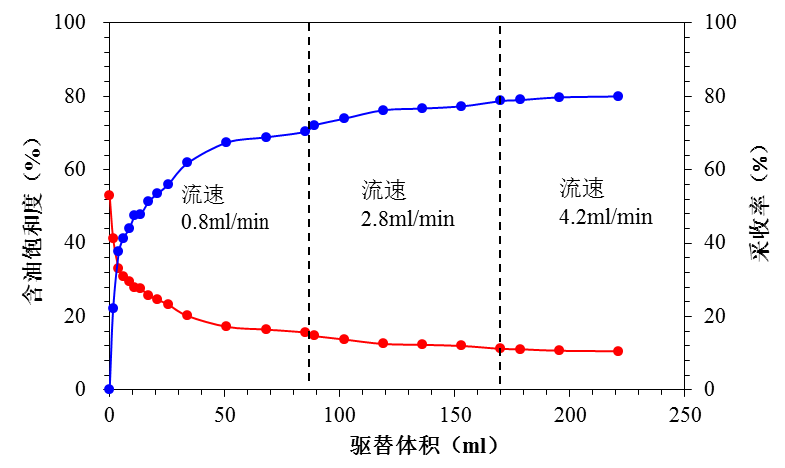 經過二次提速增能:2.8ml/min到4.2ml/min, 仍有一定效果,曲線較為平緩,含油飽和度變化較小。
