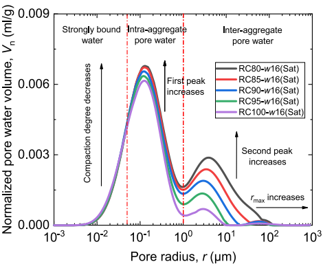 圖二顯示了不同壓實度下飽和壓制成型試樣的孔隙水分布特征:表明隨著壓實度的提高,孔隙水含量總體上呈現(xiàn)下降趨勢。這說明壓實過程中,土壤的孔隙空間被壓縮,導(dǎo)致孔隙水含量減少。