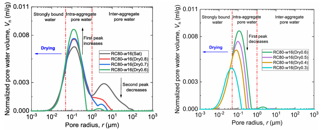 階段2(圖四b)?:隨著干燥繼續(xù)進(jìn)行,曲線面積隨飽和度降低而減小,表明土壤整體水量下降。在團(tuán)聚體間孔隙水完全排出后,團(tuán)聚體內(nèi)孔隙水含量開始快速減少。同時,整個曲線向左移動,反映了土壤干燥過程中的收縮現(xiàn)象。