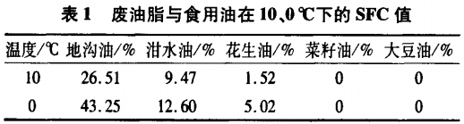分別取不同量地溝油和泔水油摻人大豆油中,使地溝油和泔水油占總油量的l%、5%、10%、20%和30%,分別記錄混合油在10、0℃下的SFC值。