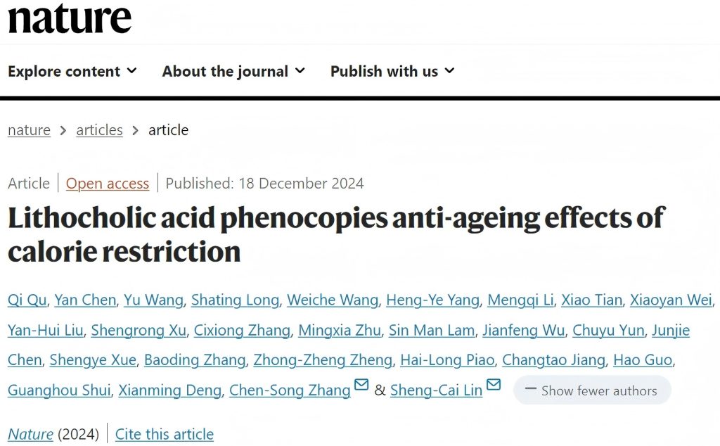 2024年12月18日,廈門大學林圣彩院士團隊在國際頂級期刊《Nature》發(fā)表題為“Lithocholic acid phenocopies anti-ageing effects of calorie restriction”的研究論文,該研究發(fā)現(xiàn)石膽酸表型模仿卡路里限制的抗衰老作用。研究人員使用代謝組學來分析在CR期間豐度發(fā)生變化的代謝物,并進行后續(xù)的功能驗證。研究發(fā)現(xiàn),石膽酸(LCA)是一種代謝產(chǎn)物,單獨使用可以重現(xiàn)CR在小鼠中的作用。這些作用包括激活AMP-活化蛋白激酶(AMPK)、增強肌肉再生以及恢復握力和跑步能力。LCA還激活AMPK,并誘導秀麗隱桿線蟲和黑腹果蠅的壽命延長和健康延長效應。作為C.elegans和D.黑腹果蠅不能合成LCA,這些結(jié)果表明,一旦施用,這些動物就能夠傳遞LCA的信號傳導效應。在所有三種動物模型中,AMPK的敲除消除了LCA誘導的表型??傊?,該研究確定了單獨施用CR介導的上調(diào)代謝物LCA可以AMPK依賴性方式賦予后生動物抗衰老益處。