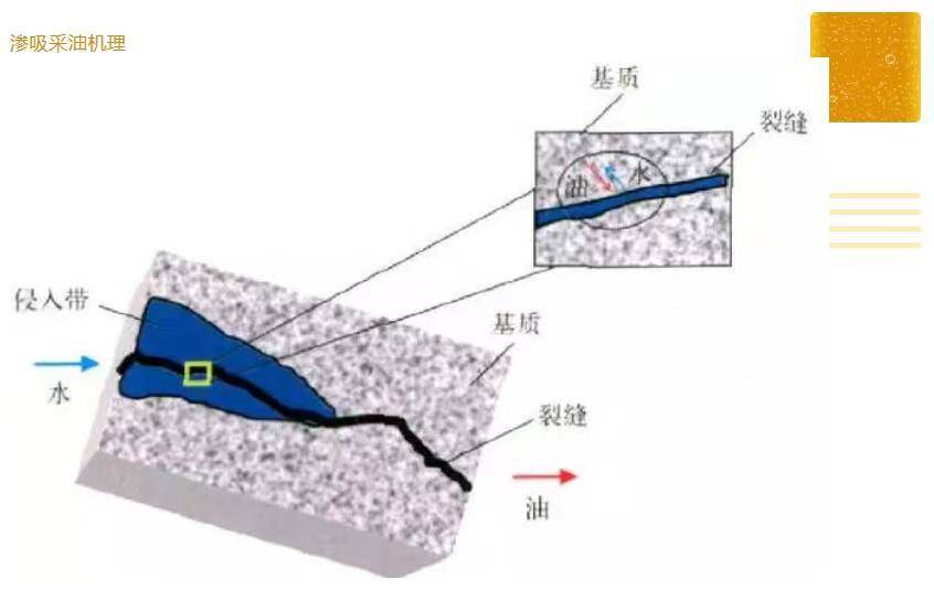 滲吸作用是開采基質(zhì)孔隙原油的有效方法,但滲吸作用的動(dòng)力問題一直沒有得到很好的解決。一般認(rèn)為滲吸的動(dòng)力是毛管力作用下的潤(rùn)濕性流體自發(fā)的吸入孔隙中驅(qū)替非潤(rùn)濕流體的過程。根據(jù)滲吸方向,可分為同向滲吸和逆向滲吸;根據(jù)流體飽和順序,可分為油驅(qū)水過程和水驅(qū)油過程,如下圖。