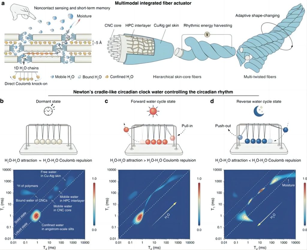 在由CNCs形成的埃尺度限域狹縫中,水通過直接庫(kù)侖撞擊進(jìn)行傳輸,類似于牛頓擺運(yùn)動(dòng)。與無序水?dāng)U散相比,這種集體運(yùn)動(dòng)模式對(duì)纖維內(nèi)水的變化表現(xiàn)出更高的敏感性。這種類似于牛頓擺的集體水運(yùn)動(dòng)結(jié)合界面融合實(shí)現(xiàn)了跨層高效水傳輸,在纖維內(nèi)形成了一個(gè)高度敏感的負(fù)反饋回路。其中,CNCs芯層內(nèi)限域水活度極低,但移動(dòng)性為T1/T2 = 1.02,接近理想值(T1/T2= 1)。近乎理想的限域水就像一個(gè)主時(shí)鐘一樣控制著加捻纖維的晝夜節(jié)律行為。當(dāng)環(huán)境中含水量與限域水相匹配時(shí),兩者停止交換,此時(shí)纖維進(jìn)入休眠狀態(tài)。當(dāng)環(huán)境含水量低于限域水時(shí),纖維呈正向循環(huán)狀態(tài),限域水開始向周圍環(huán)境輸送。當(dāng)環(huán)境含水量超過限域水時(shí),纖維進(jìn)入反向水循環(huán)狀態(tài),環(huán)境中的水被輸送到纖維中。限域水的自旋布居形狀證實(shí)了這三種不同的交換模式。