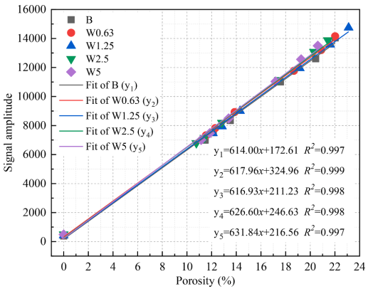 T2譜峰面積與試樣含水量呈正相關(guān),不考慮試樣中閉孔影響,則加壓飽水試樣含水體積即是孔隙體積,通過對已知含水量或孔隙度的樣品進(jìn)行核磁共振測試,可以得到峰面積與孔隙度之間的線性關(guān)系(如圖二所示)。