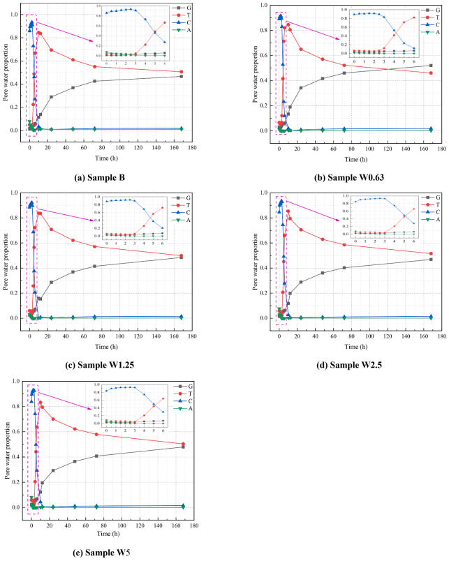 圖四為水化過程中孔隙比的變化情況。水化期間過渡孔、毛細(xì)孔和凝膠孔孔隙占比變化最明顯。其中,毛細(xì)孔和氣孔孔隙占比迅速降低,過渡孔占比先快速增大,隨后減小到一定比例后趨于穩(wěn)定,凝膠孔占比則是逐漸增大后趨于穩(wěn)定。