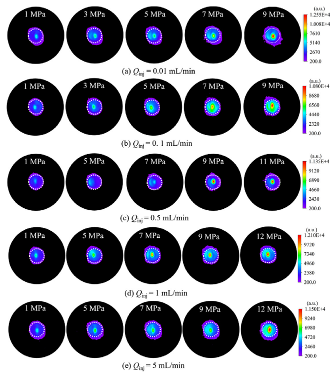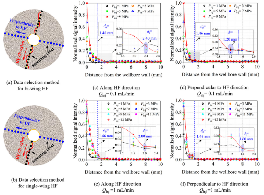 注入速率是決定水力壓裂有效性的關(guān)鍵因素,然而,注入速率對孔隙和裂隙結(jié)構(gòu)(PFS)以及注水增壓過程中流體滲透的影響很少被探索。這項研究中,在自主研發(fā)的集成核磁共振(NMR)和水力壓裂實驗系統(tǒng)上,對不同注入速率的圓柱形砂巖樣品進行了水力壓裂。結(jié)果表明,低注入速率主要導(dǎo)致宏觀孔尺度損傷;而高注入速率則促進微觀孔尺度損傷,這可能是由于孔隙內(nèi)粘土礦物的吸附膨脹效應(yīng)。此外,低注入速率樣品的水分含量持續(xù)增加,而高注入速率樣品的水分含量先增加后穩(wěn)定。磁共振成像(MRI)表明,壓裂過程中的流體滲透由于井筒周圍固有的非均勻PFS分布而表現(xiàn)出高度各向異性。此外,存在一個主要的流體滲透路徑,它與水力裂隙的起始方向一致。然而,隨著注入速率的增加,沿水力裂隙方向的流體滲透損傷距離減小,而垂直于水力裂隙方向的流體滲透損傷距離大約等于特征長度,與注入速率無關(guān)。最后,我們建議使用注水增壓過程中的孔隙損傷作為選擇支撐劑粒徑的依據(jù),并利用主要流體滲透路徑來預(yù)測水力裂隙的起始。這些發(fā)現(xiàn)為致密氣藏水力壓裂設(shè)計提供了寶貴的見解。