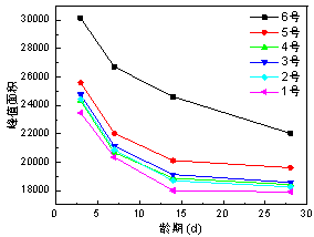 作者利用核磁共振技術(shù)對不同齡期的膠砂試件進行測試,其T2弛豫結(jié)果如圖4所示,T2弛豫譜圖顯示出三個明顯的峰值,分別代表不同相態(tài)的水分。根據(jù)核磁共振原理,峰值頂點對應(yīng)的弛豫時間T2表征水分子的運動性,峰頂點T2越大,則表示該相態(tài)水的運動性越強,被束縛程度越弱;峰值面積表征該相態(tài)水的相對量大小,峰面積越大,則該相態(tài)水含量越多;峰值比例表征該相態(tài)水含量占樣品中總水分的比例,峰比例越大,則該相態(tài)水占比越多。