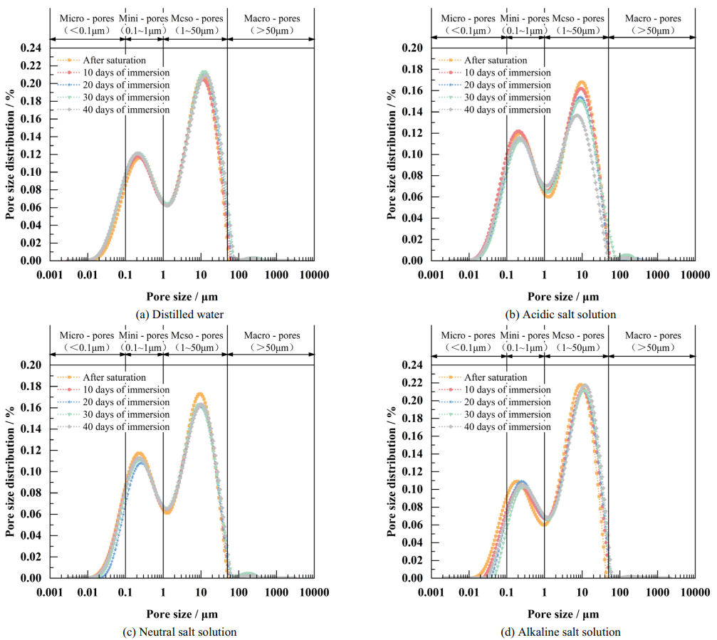 3)堿性鹽溶液:微孔比例減少(28.91%),中孔和大孔比例顯著增加(中孔增至71.09%,大孔增至4.12%)。堿性環(huán)境促進(jìn)礦物溶解和鹽結(jié)晶,形成新孔隙。