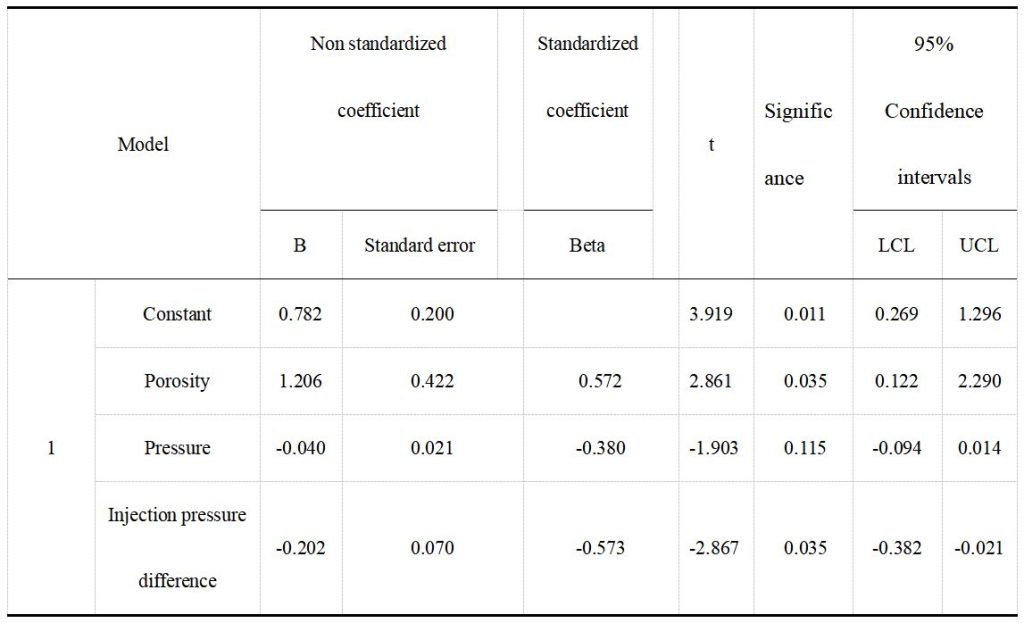 在表3中,“R”具體表示回歸模型的多元相關(guān)系數(shù)。根據(jù)表3,多元線性回歸模型的擬合表明,自變量——孔隙度、壓力和注入壓差——解釋了因變量——殘余水飽和度80%的變化。這表明,殘余水飽和度變化的80%受孔隙度、壓力和注入壓差的影響。表4顯示了每個自變量對殘余水飽和度的影響。非標準化系數(shù)(B)表示預(yù)測變量變化一個單位時因變量的實際變化。與每個系數(shù)相關(guān)的標準誤差(S.E.)反映了其估計的精度,較小的值表示更高的可靠性。標準化系數(shù)(Beta)通過消除這些單位,可以比較預(yù)測器的相對重要性。t值及其相應(yīng)的顯著性水平(p值)檢驗了每個系數(shù)的統(tǒng)計可靠性。