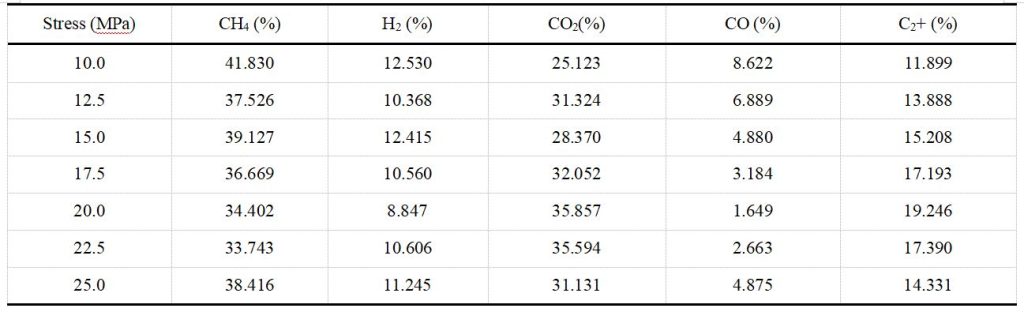 20-25.0MPa,各氣體組分的產(chǎn)量與10-17.5MPa表現(xiàn)出截然相反的趨勢,CO的產(chǎn)量隨應力的增大逐漸增大,其余各類氣體則逐漸減少。其中CO2產(chǎn)量減少13.668ml/g,CH4減少5.449ml/g,C2+烴類氣體減少