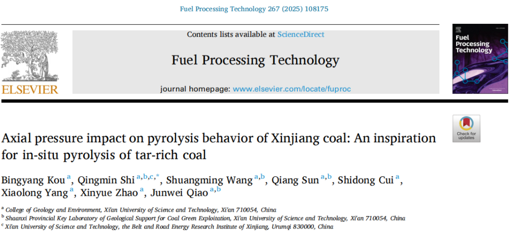 [1] Bingyang Kou, Qingmin Shi, Shuangming Wang, Qiang Sun, Shidong Cui, Xiaolong Yang, Xinyue Zhao, Junwei Qiao. Axial pressure impact on pyrolysis behavior of Xinjiang coal: An inspiration for in-situ pyrolysis of tar-rich coal[J]. Fuel Processing Technology, 2025, 267: 108175.