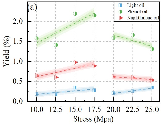 當應力升高至20.0-25.0MPa時,煤樣熱解產(chǎn)物的產(chǎn)率變化相較于10-17.5MPa呈現(xiàn)顯著差異。具體表現(xiàn)為,半焦產(chǎn)率由56.13%增至67.09%,增幅為10.96%;焦油產(chǎn)率由11.93%降至9.99%,減幅為1.94%;煤氣產(chǎn)量由115.96ml/g減少至89.66ml/g,減少量為26.3ml/g。隨著應力值的增加,煤體孔滲明顯下降,且孔隙間連通性較差,導致熱解過程中較大揮發(fā)分的釋放阻力增大,未能及時排出,停留時間延長,從而增加了二次縮合和聚合反應的可能性,進而引起半焦產(chǎn)率的增加,以及焦油產(chǎn)率和煤氣產(chǎn)量的降低。