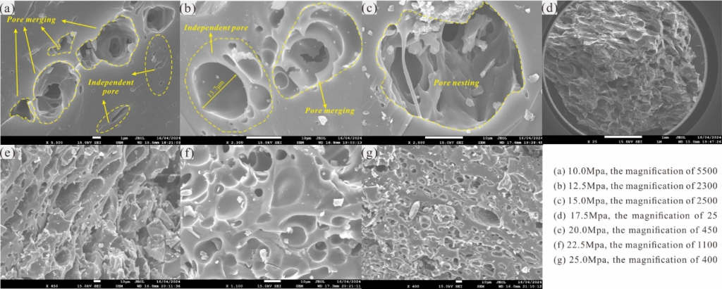 15.0MPa熱解煤樣中的氣孔合并的現(xiàn)象更為顯著,獨立的氣孔不斷擴大,隨后相鄰的孔隙壁不斷變薄甚至消失,最后孔隙之間發(fā)生合并甚至嵌套現(xiàn)象(圖3c)。17.5MPa熱解煤樣中孔隙極為發(fā)育,在放大25