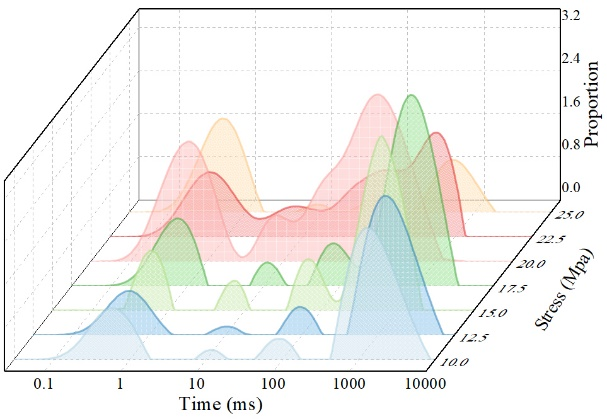 為充分對比不同應力熱解下煤樣的孔隙分布特征,將低場核磁共振T2譜數(shù)據(jù)進行體積歸一化處理。總體而言,不同應力熱解后煤樣的T2譜曲線普遍呈現(xiàn)四峰分布(圖4),其中峰1分布范圍為0.01-3ms、峰2(3ms-10ms)、峰3(10-170ms)和峰4(>170ms)。熱解煤樣的T2譜曲線在應力范圍10.0-17.5MPa和20.0-25.0MPa存在不同。10.0-17.5MPa應力范圍內(nèi),熱解煤樣T2譜的峰1的變化較小,峰1和峰2不連續(xù),表示孔隙間連通性較差。應力增加使T2譜的峰2、峰3和峰4總體均呈增大的趨勢。其中峰4的面積相比其他峰,占據(jù)著顯著的地位。在12.5MPa后T2譜的峰3和峰4的連續(xù)性逐漸好轉(zhuǎn),并且峰位逐漸向左移動,表明孔徑逐漸變小。20.0-25.0MPa,隨著應力的增大,熱解煤樣T2譜的峰1面積呈現(xiàn)先減小后增大趨勢,而峰2,峰3和峰4則持續(xù)減小。并且峰1和峰2的間距逐漸減小,指示了孔隙間連通性在逐漸變差。
