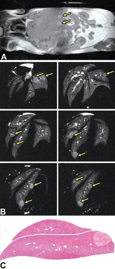 活體磁共振成像在模型小鼠中檢測(cè)到局灶性肝損傷(圖A)。肝臟的高分辨率離體MRH評(píng)估可以在小鼠(圖B和C)中鑒定幾個(gè)單獨(dú)的局灶性脂肪病變。通過(guò)常規(guī)組織病理學(xué)證實(shí)病變?yōu)榫衷钚灾靖淖儯▓DC)。