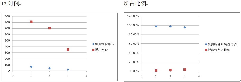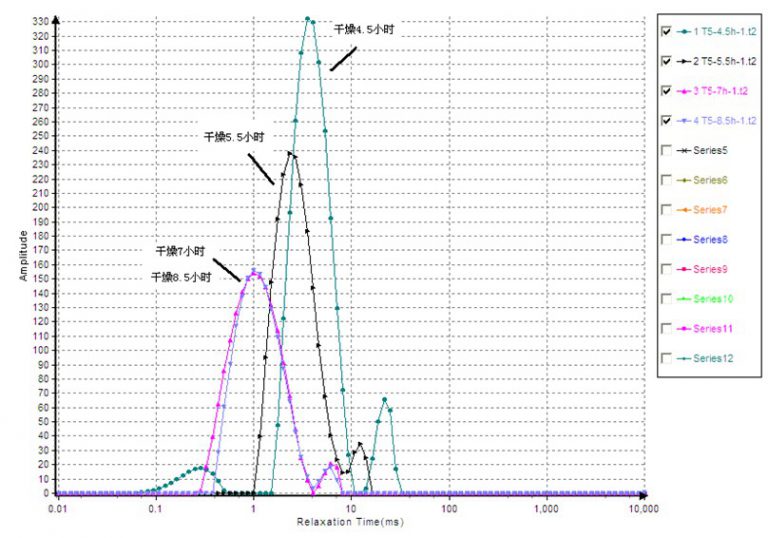 從上圖可知,在干燥3小時(shí)樣品中存在的析出水峰和肌肉結(jié)合水峰在干燥4.5小時(shí)的樣品中消失了,因?yàn)樵俣痰奈龀鏊錞2值總是要比初始肌肉結(jié)合水T2長(zhǎng)的,顯然在大于65ms以外的地方在干燥4.5小時(shí)的譜上沒(méi)有任何的峰存在。當(dāng)樣品不再析出水分了,說(shuō)明肌肉組織已經(jīng)遭到破壞沒(méi)有持水力了,肌肉結(jié)合水也完全消失。因此,從第二個(gè)階段起,圖上的譜峰已經(jīng)不再是析出水分和肌肉結(jié)合水了。