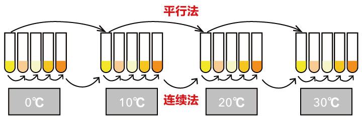就像平行法那樣采用不同的水浴溫度,連續(xù)法需要與平行法一樣多的水浴,這里所有的批樣品在轉(zhuǎn)移到下一個(gè)水浴中預(yù)熱之前在相同的溫度下預(yù)熱。耗費(fèi)的時(shí)間比平行法要長(zhǎng)。