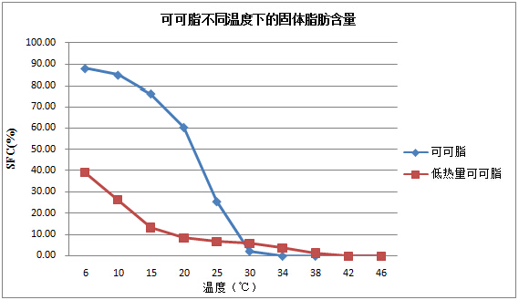 測(cè)試結(jié)果:完成兩種可可脂樣品在不同溫度下固體脂肪含量測(cè)試。兩種可可脂樣品有明顯的區(qū)別,固體脂肪含量SFC大小為:可可脂>低熱量可可脂(環(huán)境溫度小于30℃)??煽芍泄腆w脂肪的融化速率要大于低熱量可可脂中固體脂肪的融化速率。