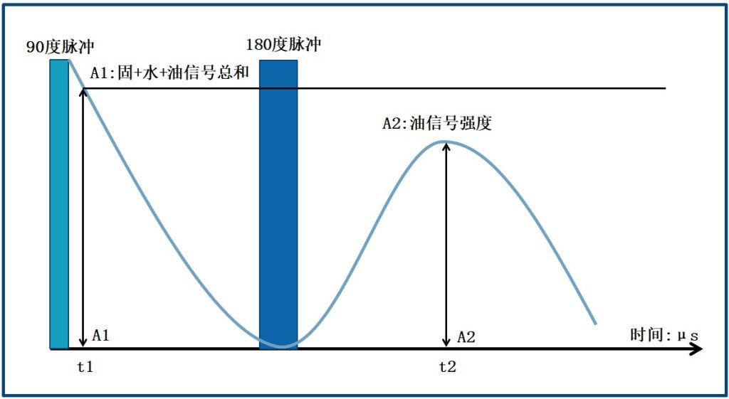 使用自旋回波序列進(jìn)行測(cè)量,圖一是自旋回波序列與檢測(cè)到的核磁信號(hào)。在90度射頻脈沖后t1處測(cè)量了自由感應(yīng)衰減(FID)NMR信號(hào)。此時(shí)信號(hào)幅度(A1)與樣品的兩個(gè)液相(水分和油分)中的H質(zhì)子數(shù)成正比。180度脈沖后,檢測(cè)自旋回波信號(hào)幅度為A2,此時(shí)水的信號(hào)已經(jīng)衰減為0,A2僅為油的信號(hào)。