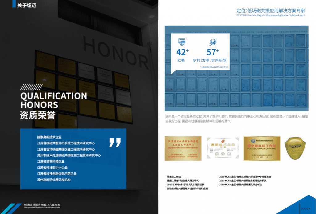 公司成立至今,已通過(guò)ISO 9001:2015質(zhì)量管理體系認(rèn)證、CE認(rèn)證,建立了國(guó)家博士后工作站、江蘇省博士后工作站、研究生工作站和區(qū)研究生工作站,同時(shí)已被認(rèn)定為江蘇省核磁共振分析系統(tǒng)工程技術(shù)研究中心、蘇州市低場(chǎng)核磁共振儀器工程技術(shù)研究中心、蘇州市納米空隙核磁共振檢測(cè)工程技術(shù)研究中心、蘇州市企業(yè)技術(shù)中心、江蘇民營(yíng)科技企業(yè)、江蘇省科技型中小企業(yè)等。?