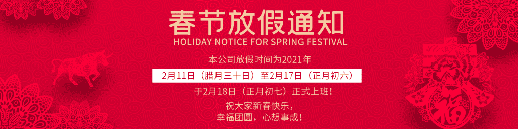 春節(jié)將至,蘇州紐邁分析儀器有限公司感謝新老客戶和全體員工在2020年給予我公司的鼎力支持。在2021年春節(jié)即將來(lái)臨之際,恭祝大家新春愉快,合家歡樂,萬(wàn)事如意,牛年吉祥!為響應(yīng)和遵守國(guó)家關(guān)于抗疫防控的政策規(guī)定,根據(jù)國(guó)務(wù)院《2021年節(jié)假日放假安排時(shí)間表》有關(guān)規(guī)定,公司春節(jié)放假安排如下: