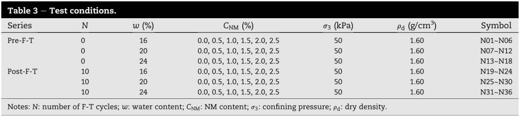 樣品制備、動(dòng)態(tài)三軸試驗(yàn)和核磁共振試驗(yàn)是在中國西安某重點(diǎn)實(shí)驗(yàn)室進(jìn)行的。干燥后的黃土首先被研磨并通過2毫米的篩子,然后在110℃下與NM一起烘烤24小時(shí)。隨后,根據(jù)預(yù)先設(shè)計(jì)的混合比例,對它們進(jìn)行人工攪拌。同質(zhì)混合物依次壓實(shí)成一個(gè)圓柱形。對于每個(gè)樣品,干密度被控制在1.60g/cm3。之后,在20±2℃下將它們密封并固化28天。