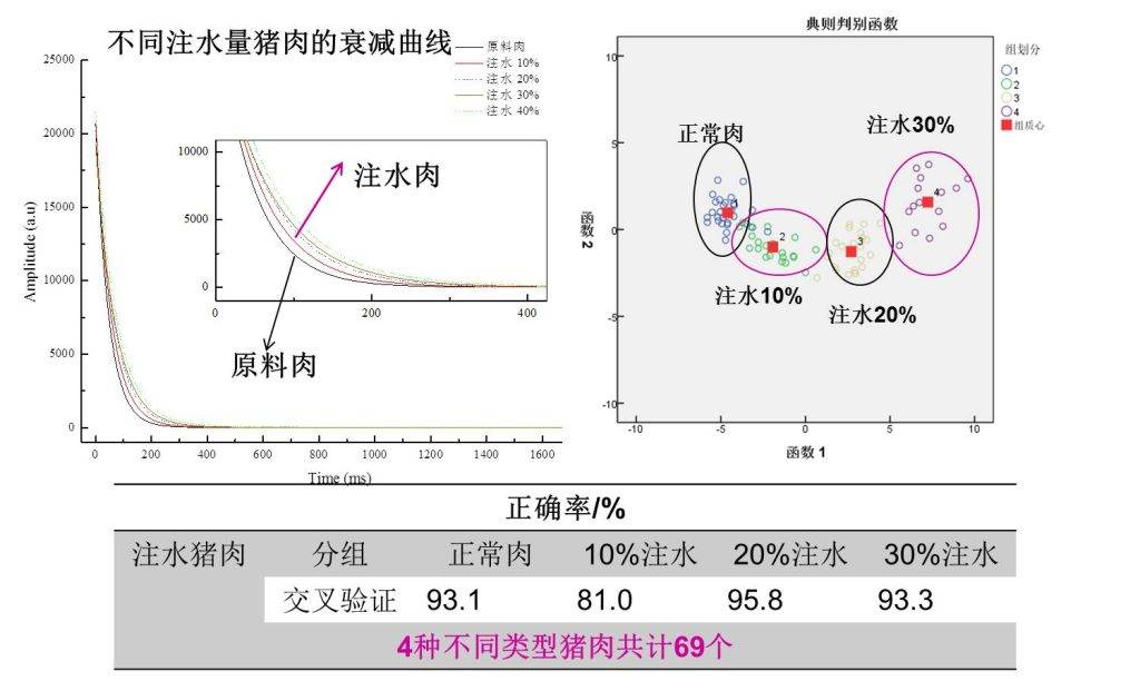 除鑒別注水肉之外,也能鑒別注射黃原膠、卡拉膠、魔芋膠等添加劑的非法豬肉,低場核磁共振的無損快速的優(yōu)勢為其應(yīng)用到食品安全的執(zhí)法現(xiàn)場提供了可能。