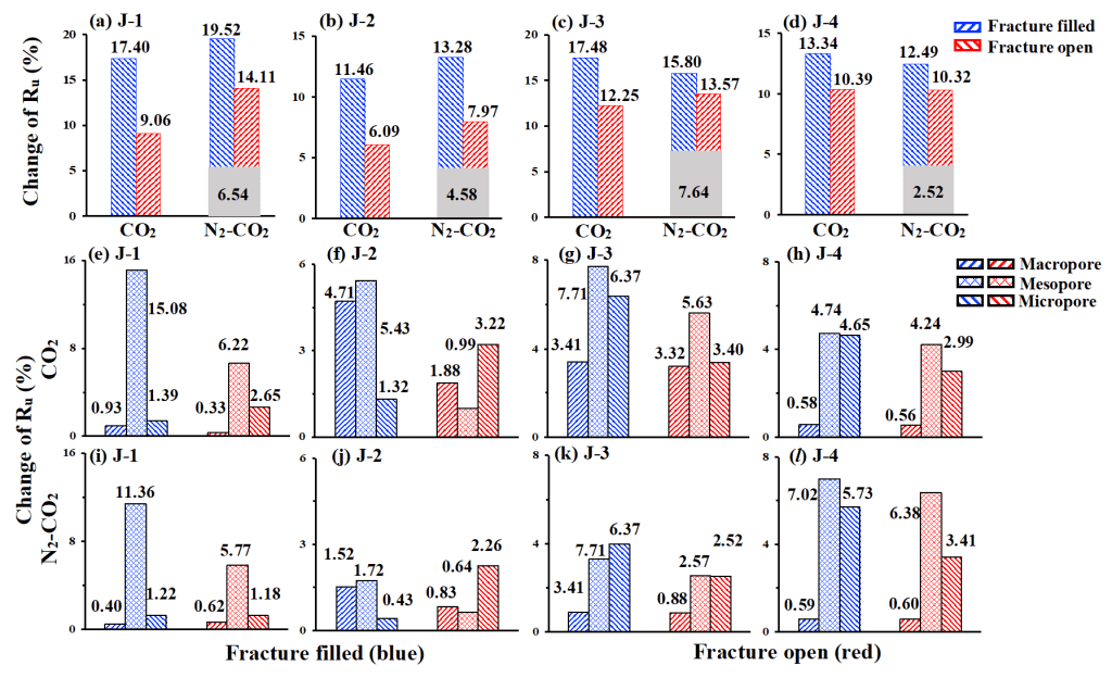 以壓裂前M0采收率為基值,對比裂縫和氣體組合下的增采量Ru(圖6)?;|(zhì)巖樣M0注N2-CO2效果要好于純CO2(灰色,Dong,2020a)。相比于純CO2吞吐模式,壓裂樣品注N2-CO2在微孔發(fā)育巖樣(J-1和J-2)中效果好,但在宏孔發(fā)育樣品中效果差(J-3和J-4),推測與N2分子對小孔的彈性支撐作用有關(guān)。裂縫會存儲大量氣體,尤其是CO2,削弱氣體在基質(zhì)孔隙的擴(kuò)散動能,使得總采出量下降(紅色)。裂縫填充處理可以增大氣體在基質(zhì)孔隙中的波及效率,增大采收率(藍(lán)色)。短期來看,造裂會大幅度提高產(chǎn)量;但縫的儲氣性對長期開發(fā)會產(chǎn)生不利影響。