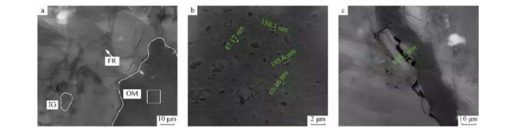 對來自涪陵龍馬溪組頁巖巖心(H8)進(jìn)行高分辨率FIB-SEM觀測,識別孔隙類型。下圖顯示頁巖中細(xì)粒礦物粒間孔隙(無機孔)、有機孔及微裂縫分布。3種孔隙具有不同分布范圍:有機孔尺寸小,為納米級別,細(xì)粒礦物粒間孔隙為微米-納米級別,微裂縫尺寸較大,為微米級別。