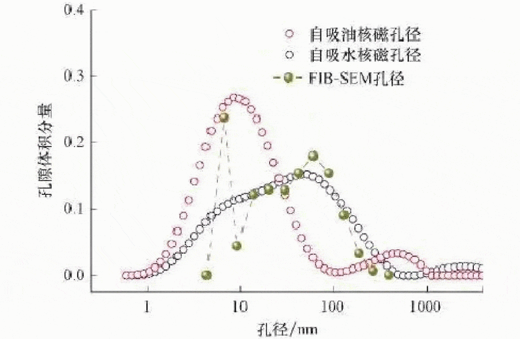 這種分布與核磁T2譜三峰分布具有一致性。下圖核磁孔徑分布是采用公式轉(zhuǎn)換得到,其結(jié)果與利用掃描圖像確定的孔徑分布吻合。進(jìn)一步證明,利用核磁共振技術(shù)識別與評價頁巖有機孔和無機孔是可行的。