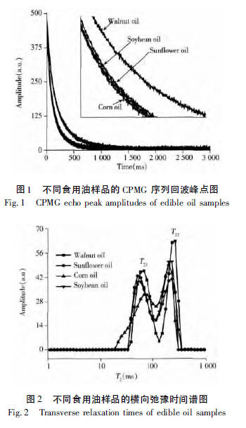 案例1:?jiǎn)我挥蜆訉⑼粎?shù)條件下測(cè)定的核桃油、玉米油、大豆油和葵花油的CPMG 弛豫衰減信號(hào)和T2弛豫檢測(cè)結(jié)果用專業(yè)軟件進(jìn)行T2反演,所得數(shù)據(jù)