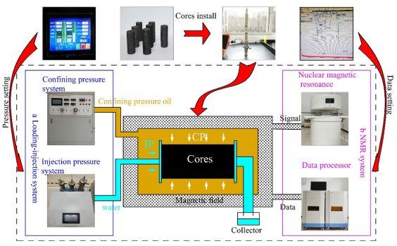 加載-注入核磁共振是研究模擬原位應(yīng)力和連續(xù)注入環(huán)境下孔裂隙結(jié)構(gòu)演化的重要技術(shù)。煤體孔裂隙結(jié)構(gòu)通常通過(guò)氣體吸附、壓汞、小角x射線散射和掃描電鏡來(lái)研究,然而這些方法不能對(duì)樣品施加壓力。CT與微CT的分辨率稍顯不足。各方法對(duì)比如圖2。通過(guò)核磁共振研究實(shí)時(shí)孔徑分布較為簡(jiǎn)單。然而單獨(dú)使用核磁共振觀測(cè)模擬原位應(yīng)力和連續(xù)注入環(huán)境下的孔裂隙結(jié)構(gòu)演化同樣不可能的,因此本文開發(fā)了加載-注入核磁共振系統(tǒng),如圖3。煤芯最大直徑和長(zhǎng)度分別為25.4mm和60mm。系統(tǒng)通過(guò)使用氟油對(duì)徑向施加圍壓,最大圍壓25MPa;最高溫度150℃;液體或氣體通過(guò)軸向注入煤芯。